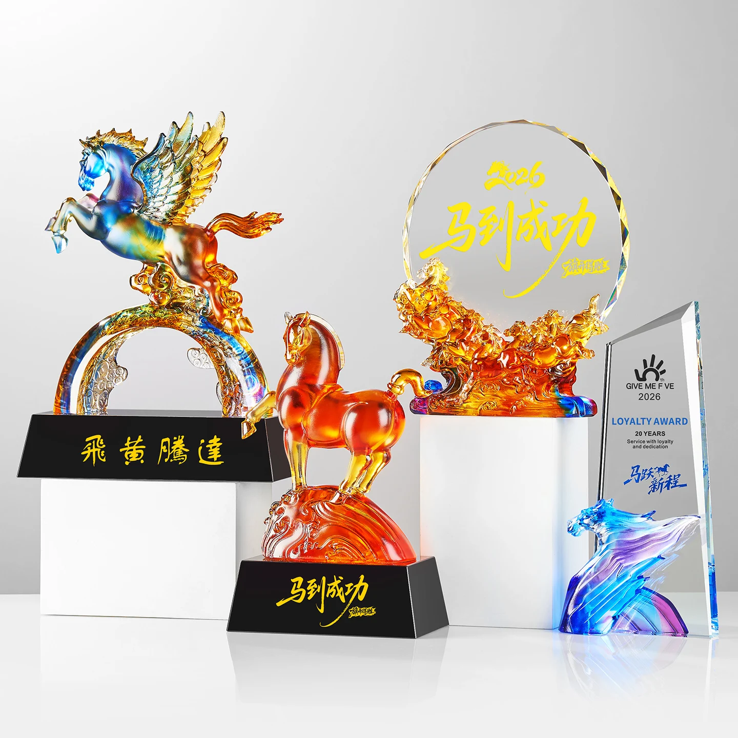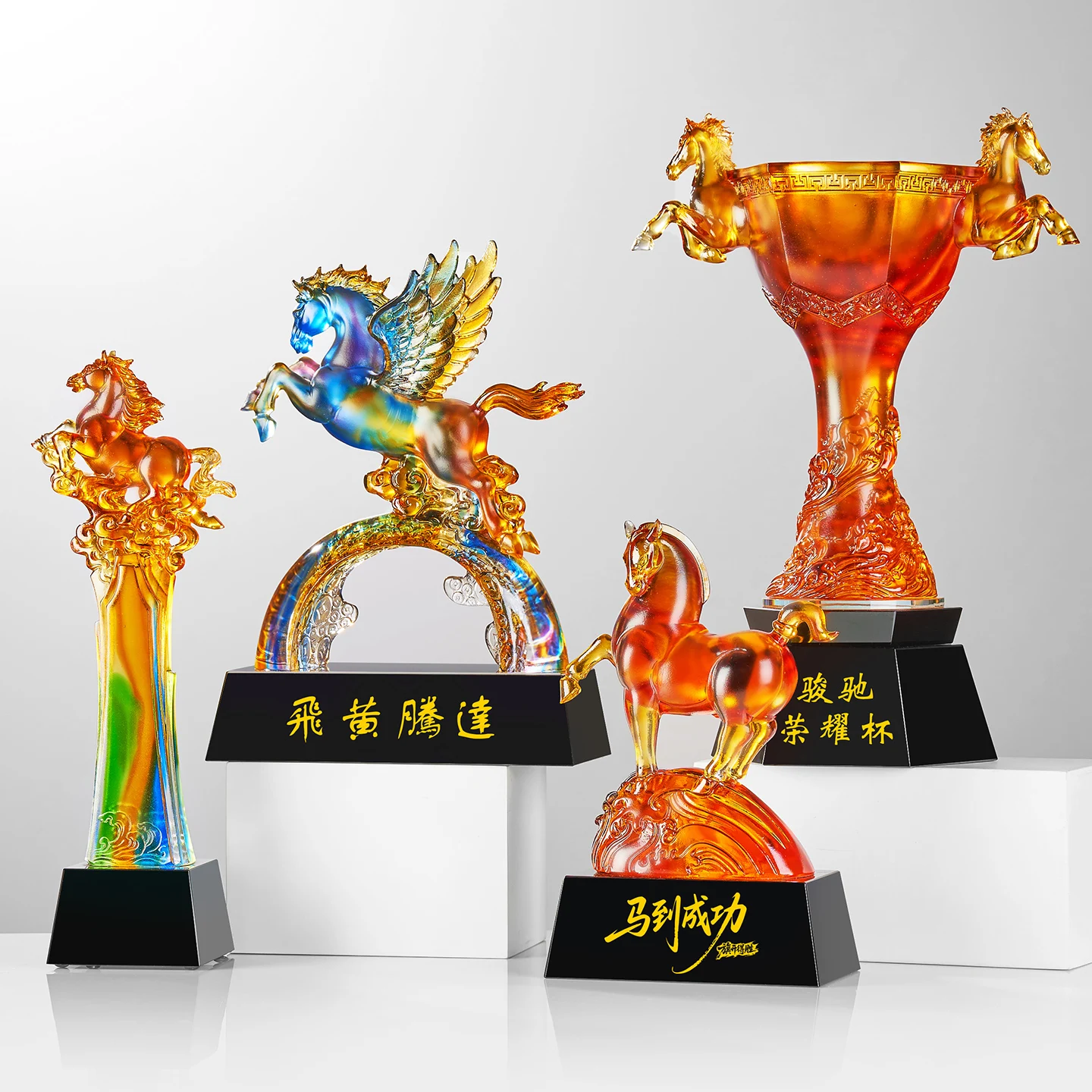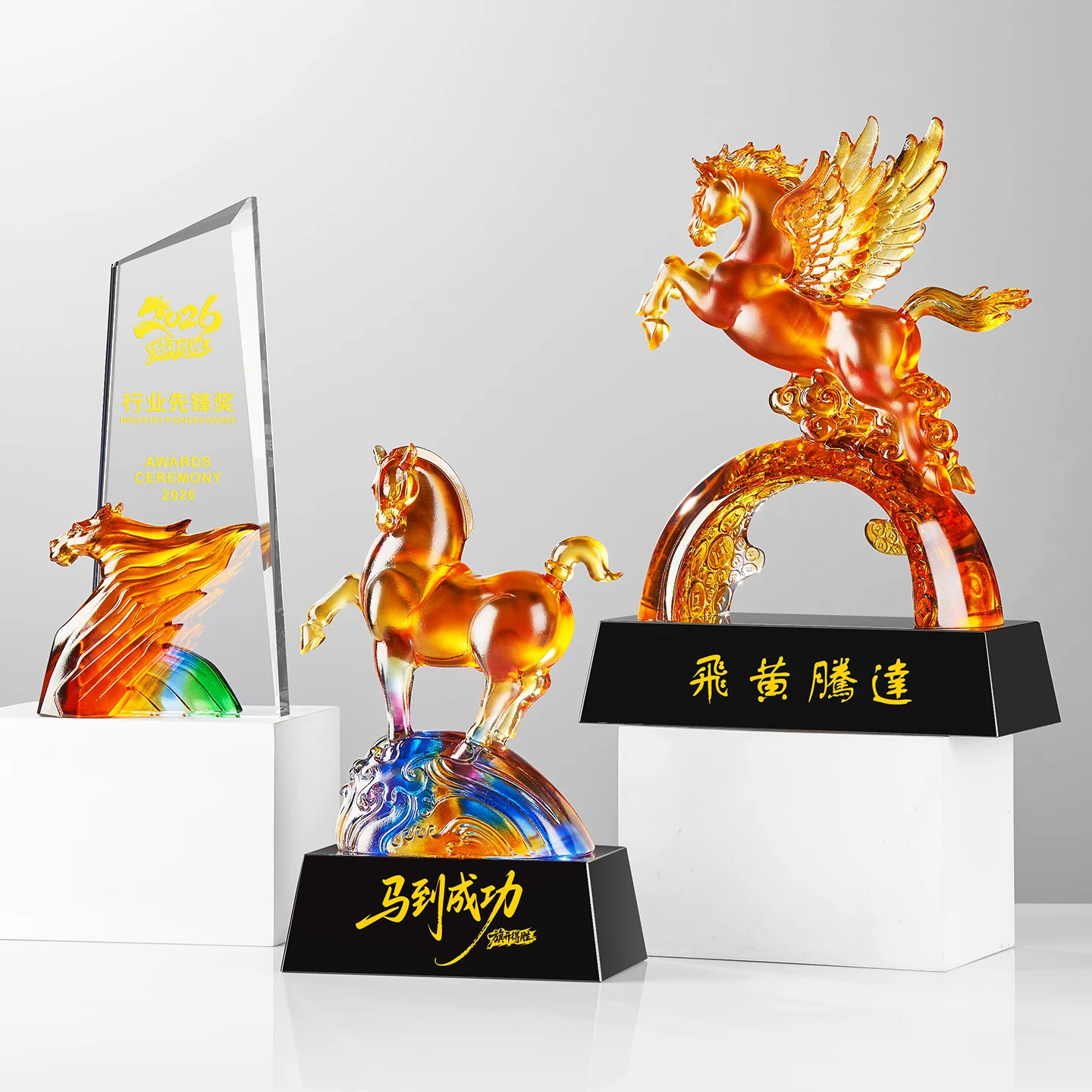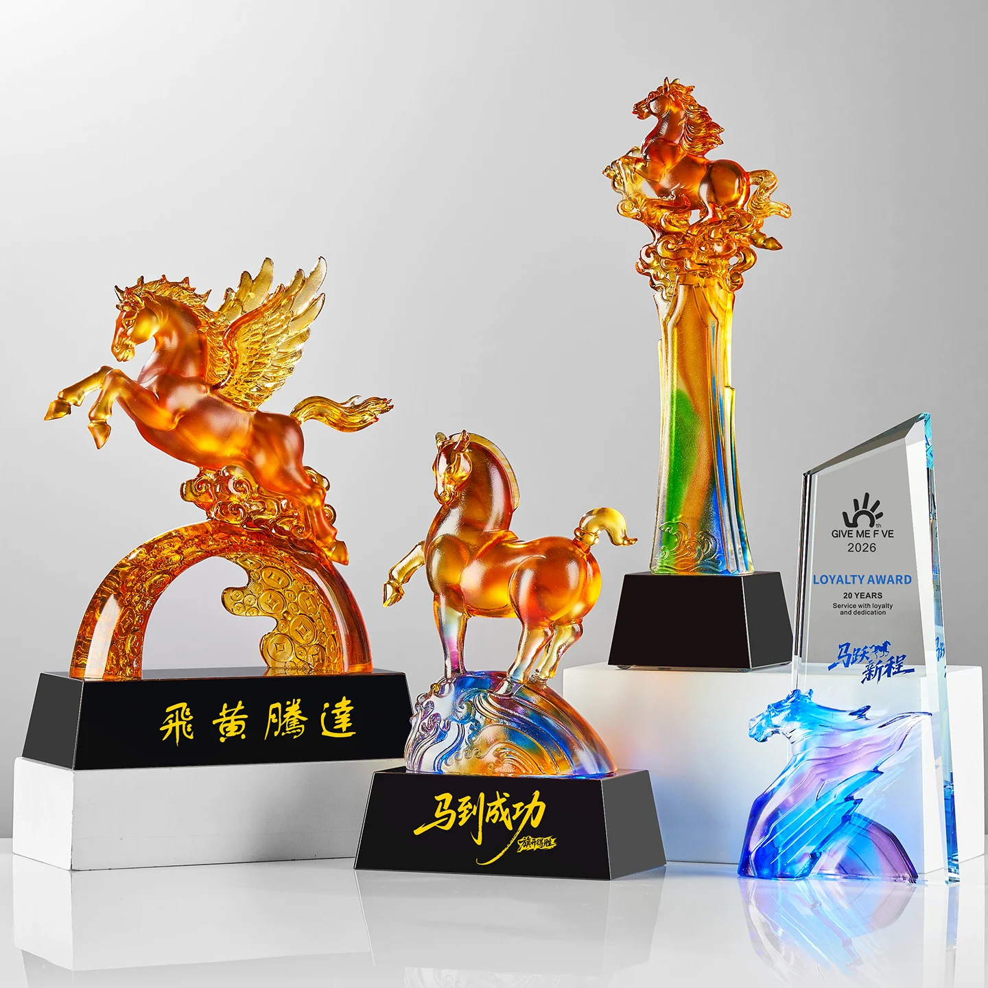 Trophée en cristal Liuli artisanal personnalisé de style Feng Shui, vendu en gros par l'usine, figurine Année du Cheval pour récompenses professionnelles