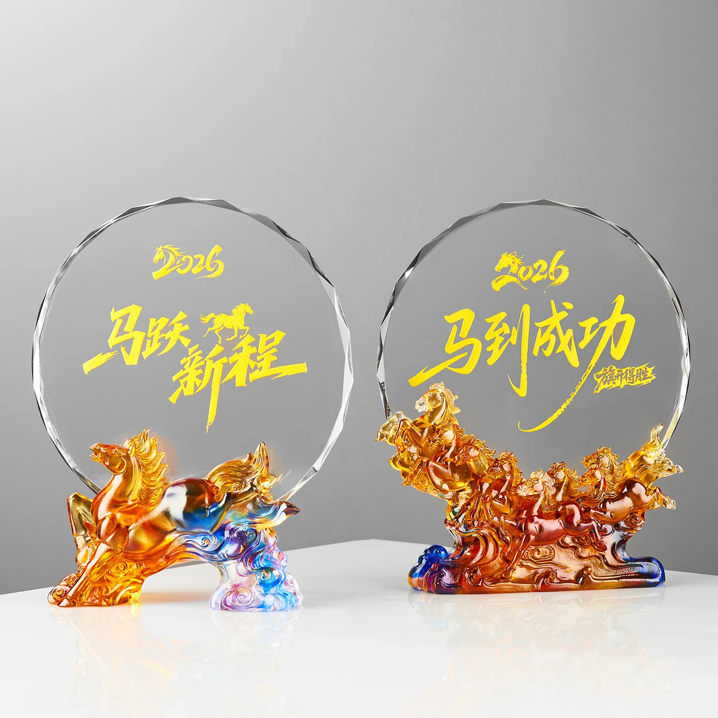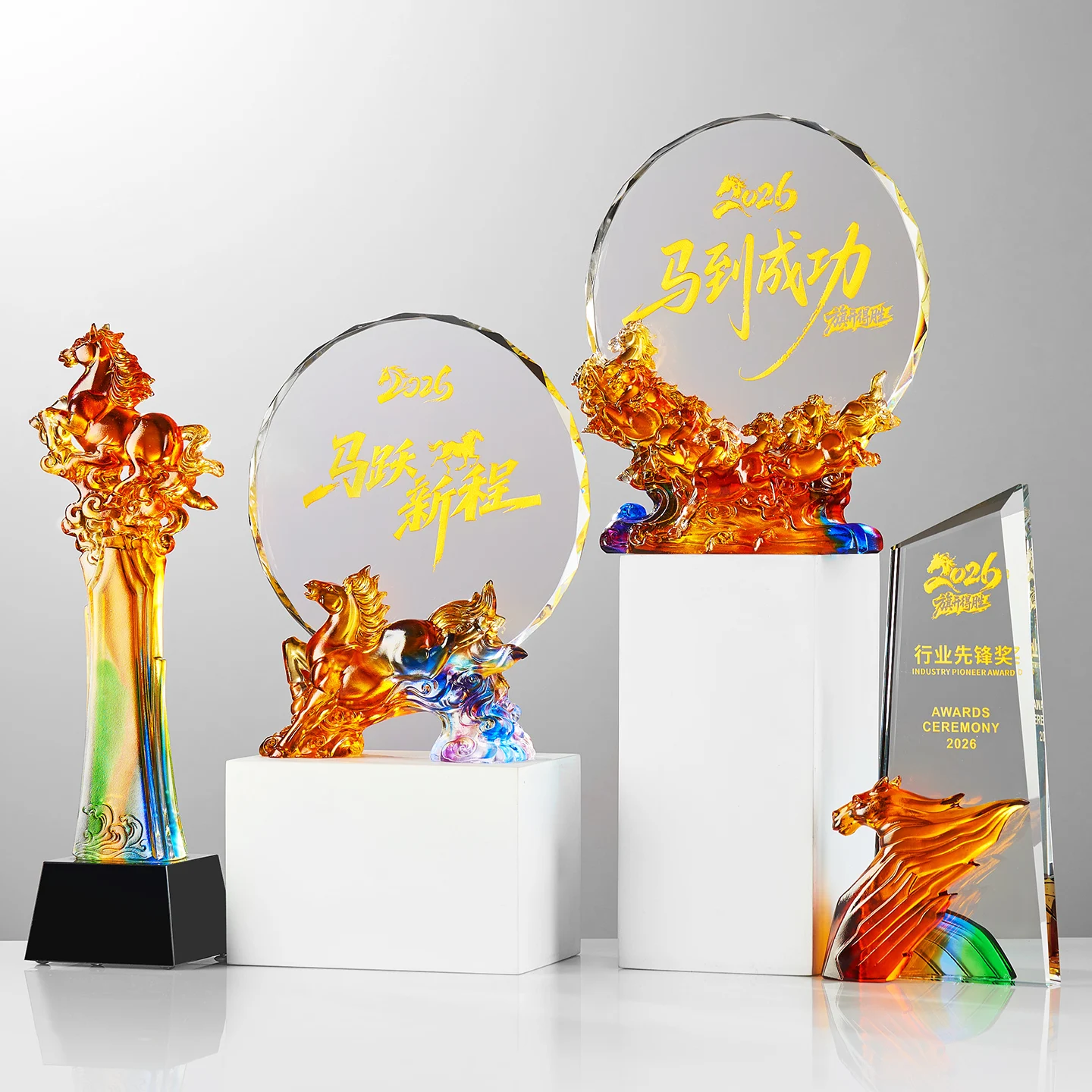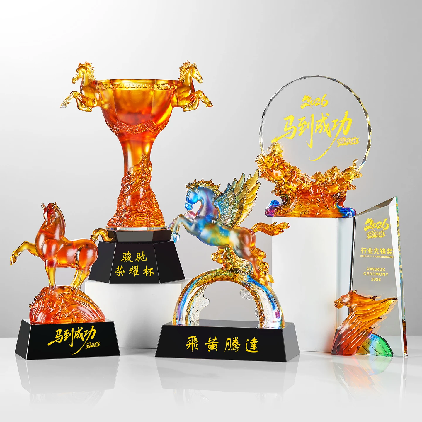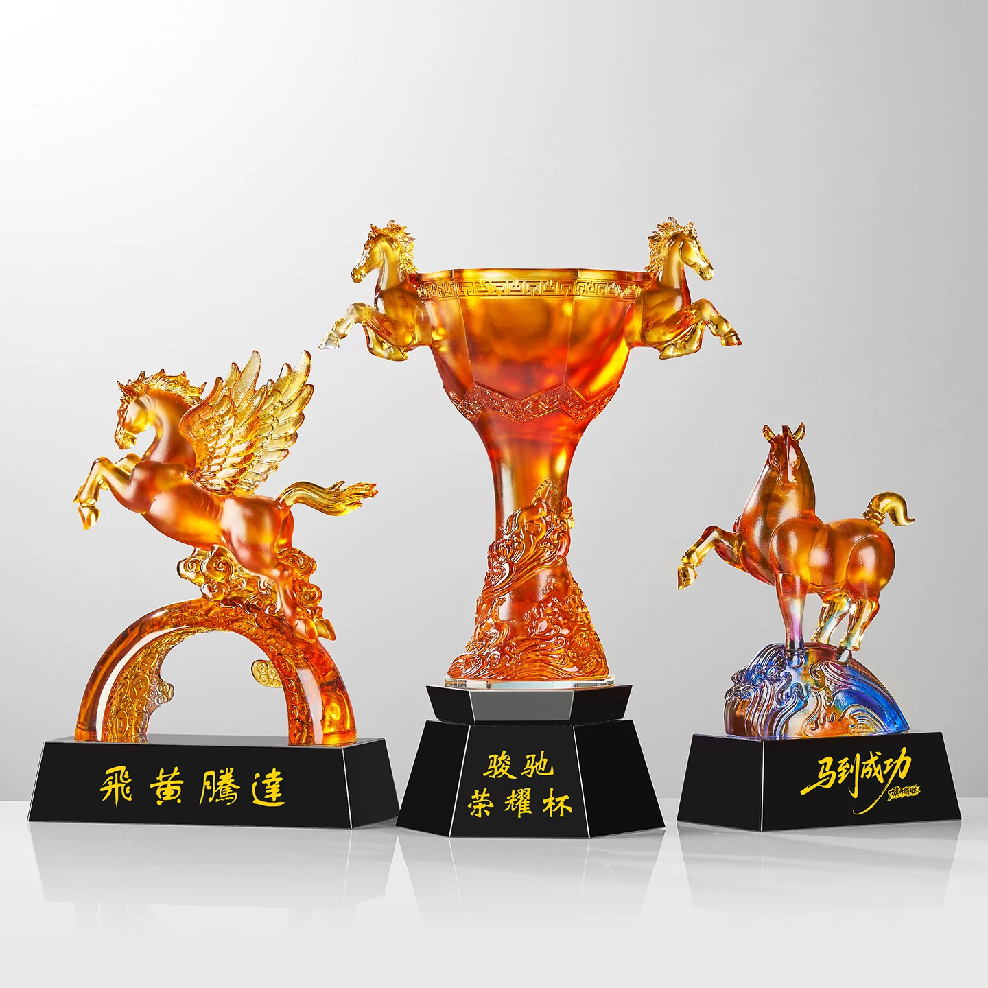 Trophée en cristal Liuli artisanal personnalisé de style Feng Shui, vendu en gros par l'usine, figurine Année du Cheval pour récompenses professionnelles